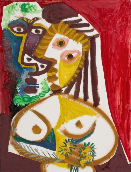 Curator: Picasso’s "Buste d’homme," painted in 1968, confronts us with its fractured portrait. Painted using oil paint. The use of figuration within abstraction is definitely intriguing here. Editor: Well, that's certainly...vibrant. Almost aggressively so, with those stark contrasts. I'm struck by how heavily the paint has been applied in some areas. You can really see the gestures, the build-up of layers, like a raw, immediate process. Curator: Indeed, look how the cubist fragmentation dislocates familiar features, creating new symbolic relationships. The single prominent eye, the disjointed mouth – do they suggest a distortion of power, or a breaking down of conventional masculinity? Editor: I see that fragmentation less as symbolic and more as…visceral. Consider the oil paint itself; its thickness, the speed of application—it embodies the urgency of its making. What materials did he have to hand and what was the atmosphere like in the studio at this time. Curator: That speed is what grants it energy, isn't it? Picasso here returns to symbolism, in the midst of expressionism - there's an immediate continuity in his images with past memories and signs of cultural and personal significance. Editor: Continuity maybe, but what were the costs? It’s difficult to ignore that access to material, the labour… These things contribute just as much to the meaning as any inherited symbolism. I would be interested in how quickly Picasso went through these materials and where he had access to the source of his art materials from. Curator: Well it depends on what is prioritized, the consumption or artistic impact, right? How might later audiences process these signifiers based on different understandings of art history, or even gender? The bust here almost resembles the form of an abstracted king of sorts. Editor: And yet we, the viewers, engage with these layers on different grounds depending on context. Not all cultural significance is inherently carried within symbols - sometimes it is shaped simply through materiality. It is a two-way encounter for the art as well. Curator: I like how you note this push and pull in the material; however, for me it lies mostly within how those raw materials are imbued with the capacity to resonate with history. Thanks for adding new layers here. Editor: Absolutely! It is by delving into materials that we unveil further art, and that helps broaden our understanding beyond conventional narratives.