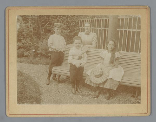 This small, sepia-toned photograph captures Wilhelmina Gerarda Hoogendijk with her children and mother in a garden. What strikes me about this image is its monochrome palette, a dance of warm browns and creams that soften the edges of time and place. Look closely, and you'll notice the way light dapples the faces, how it catches on the fabric of their clothes, and the leaves in the background, creating a soft haze around the figures. See how the photographer has used light to create a focal point, a space of rest? The mother and children are arranged neatly in a row, but the way the picture fades toward the bottom evokes a sense of time passing, the picture almost dissolving back into the earth. This photograph is like a whispered conversation, a secret shared across generations. It reminds me of the quiet moments in Édouard Vuillard’s paintings, where domestic scenes become windows into the inner lives of his subjects. Like Vuillard, the anonymous photographer embraces ambiguity, allowing the viewer to project their own stories onto the scene.