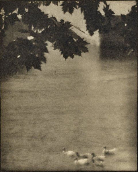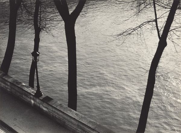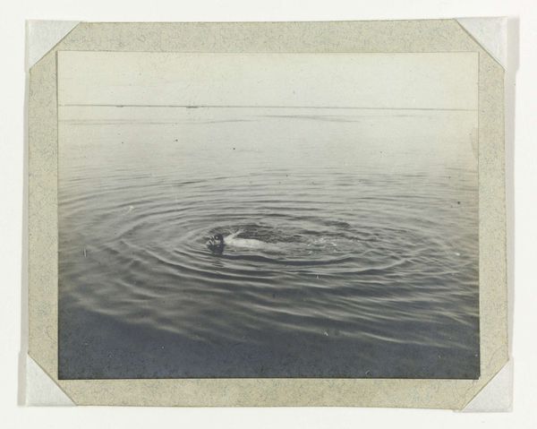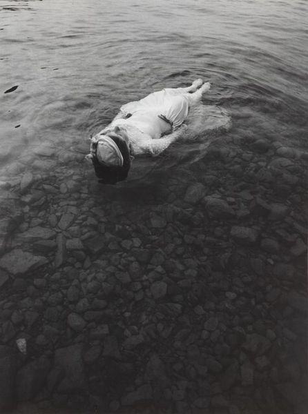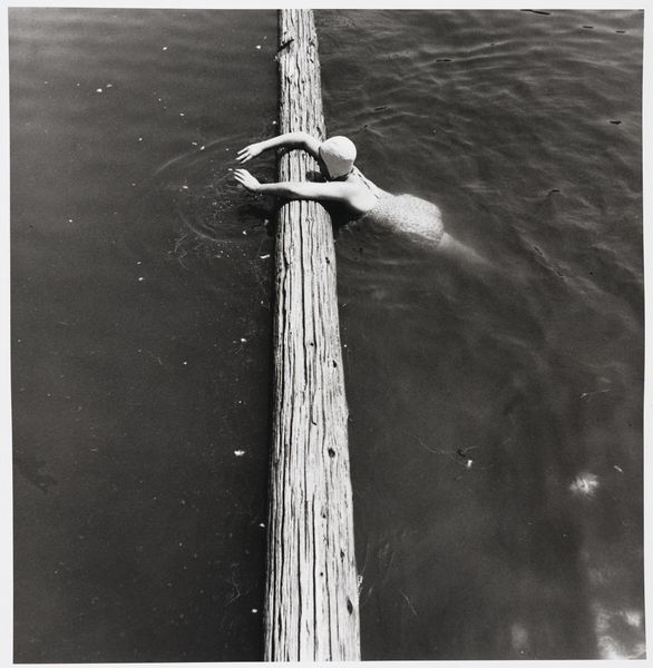 Curator: Larry Silver’s photograph, Boy on Log in East River, NYC, offers a compelling study in contrasts, captured in a modest 40.6 by 50.8 cm format. Editor: It feels almost dreamlike, doesn't it? That lone figure clinging to the rough wood, suspended between the grimy river and, well, nothing else. Curator: The high-angle shot flattens the perspective, emphasizing the stark texture of the log against the dark, amorphous water. Note the tension between the boy’s vulnerable form and the imposing verticality of the timber. Editor: Right. It’s a solitary moment—almost a baptism, a kind of gritty urban purification. I can practically smell the river... Curator: Indeed, the photograph's formal qualities—the tonal range, the compositional balance—speak to a keen awareness of photographic syntax. Editor: More than that, it whispers of childhood summers, of dares, and of finding little pockets of freedom in the most unexpected corners of the city. Curator: A convergence of form and feeling, wouldn't you agree? Editor: Absolutely. A deceptively simple image with surprising depth.