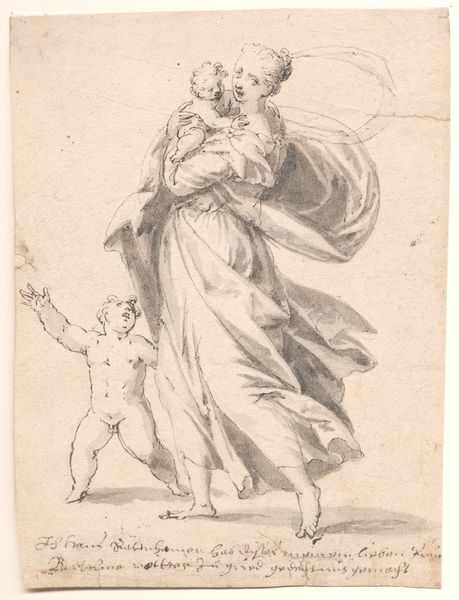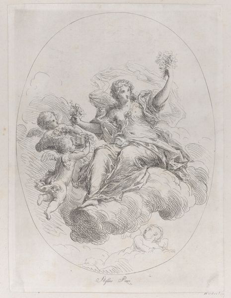 Editor: This is Jean Morin's "Groupe de deux angelots (regardant vers la droite)," made sometime between 1605 and 1650. It's an engraving – a print – of two cherubic figures. The shading is quite lovely. It gives the figures almost palpable form, despite the minimalist composition. How do you interpret this work? Curator: Ah, yes, Morin’s cherubs! To me, they're Baroque exuberance distilled into monochrome. The one on the right clutches a laurel wreath like he's just won some celestial Olympics. You can almost feel the weight of it in his chubby fist! And do you see how the folds in the sash seem to mimic their movements? Editor: Yes! And one has a quill. They feel very active, even celebratory. Why cherubs, though? Was this a popular subject? Curator: Oh, absolutely. These figures, especially in the Baroque period, aren’t just cute babies. They’re allegorical figures, conveying divine love or inspiration. Look how they gaze upwards, their eyes almost sparkling with holy light. This wasn't merely decorative; it was intended to elevate the viewer's thoughts. But tell me, does this image conjure other images for you? Something less pious perhaps? Editor: Now that you mention it, they DO have that look like, you know, when you get caught doing something mischievous… like eating too much cake. Curator: (laughing) Exactly! Divine or gluttonous, there’s an inherent sweetness about them. Morin captured a certain joyful mischief that transcends the ages. What I love most is how accessible he makes the divine through these plump, cheeky beings. Editor: It's amazing how much personality he conveyed with just lines, isn't it? I will definitely look at Baroque art with a new perspective now. Curator: Indeed. Next time you see a chubby angel, remember, it might be thinking about cake, or poetry…or maybe both!
