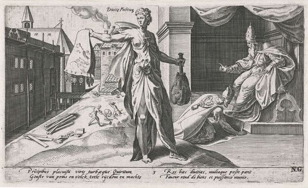 This engraving titled "De geneesheer als engel" or "The doctor as angel" was made around 1600 by Johann Gelle. It seems to respond to a period of cultural and religious transition in the Netherlands, in which the roles of faith and medicine were being renegotiated. Look at the way the artist interweaves the earthly and divine realms: a doctor tends to a patient indoors, while a large, androgynous angel is looking down over the scene. The angel may be seen as a comforting symbol of divine intervention at a time of uncertainty. This image also raises questions about the social status of the artist at that time. Was Gelle's representation of doctors as angels an attempt to elevate their social standing, or to highlight their importance within a changing society? To understand this image better, we can consult historical texts, medical manuals, and religious pamphlets from the period. Examining the cultural context in which art is made is key to understanding its purpose and significance.