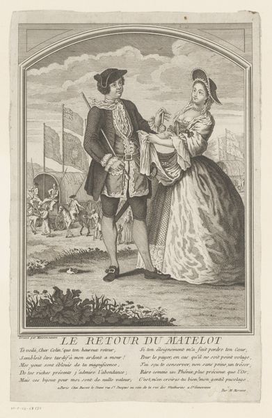 Editor: Here we have James McArdell's 1752 print, "Portret van Thomas Lowe en mevrouw Chambers als kapitein Macheath en Polly," currently housed at the Rijksmuseum. It's quite a formal portrait, despite depicting these figures seemingly in costume. What do you see when you look at this work? Curator: I observe a fascinating interplay of lines and forms. The artist has meticulously rendered the textures of the fabrics, note the crisp folds of the woman's skirt against the smoother finish of the man's coat. There is an interesting tension created by the near symmetry in their placement and pose, balanced with asymmetry in their dress and direction of gaze. Notice how the doorway behind the female figure is offset. Editor: The contrast between the woman's ornate dress and the plain doorway is something I hadn’t fully registered. What is its effect? Curator: Semiotically, we might read it as a comment on artifice versus reality. The couple's elaborate attire signals a performance, or a constructed identity, while the background suggests a more fundamental truth. The engraving itself uses light and shadow strategically. Could you describe the tonal relationships present within the piece? Editor: Well, there's definitely a strong contrast; the subjects are well-lit and pop against a dark backdrop. But look closer, there are gradations and subtleties there. That soft glow almost adds a sense of dynamism. Curator: Precisely. The dynamism derives from strategic and contrasting applications of the technique of mezzotint engraving to capture light. And, again, observe how that is played off against very regimented line work for detail. Editor: It’s amazing to consider how McArdell captured so much texture using solely line and tone. I learned a lot today, thank you. Curator: Indeed. Examining the structure of the forms and the contrast is key. These principles grant one a new means of appreciation for not only the work but the processes by which that work was made.