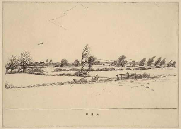 Curator: What a serene vista! There's an exquisite calmness to it. Editor: Yes, the placidness certainly emanates from Jacobus Ludovicus Cornet’s etching, "Veenplas," created around 1854. It resides here in the Rijksmuseum, if you’d like to view it after this commentary. Curator: The subtle lines give it a misty, almost ethereal quality, doesn't it? Notice how the horizontal composition draws the eye across the watery expanse? The negative space above feels limitless, and yet perfectly balanced with the detail below. Editor: Absolutely. And if you delve into the symbology, stagnant pools of water—like the 'Veenplas,' or peat lake—often represent the subconscious, those mysterious, deep parts of the mind that are sometimes difficult to navigate, as they say. Curator: An interesting take. I was thinking more of how Cornet employed the etching technique, achieving a striking tonal range despite its monochromatic nature. The use of line weight to define form and create depth is quite masterful, drawing me back to structure first. The linear aspect of the ditches creates an unusual rhythm and division of the land and lake, bisecting these open areas with geometric lines, adding rigidity. Editor: Precisely! It's a tension—that is potent, considering peat bogs also stand for liminal spaces, thresholds where our reality blurs between the known and the unknown, a literal point of transformation if there ever was one. So the land literally creates the gateway. The birds could very well speak to the passing of thoughts to one's internal emotional landscape, which the Dutch notably portrayed often in 17th-century paintings and onwards. Curator: An intriguing reading of these simple birds. The eye perhaps tries to find balance between their movement in relation to the static stability of the water's surface. I wonder how much Cornet was conscious of that. Editor: Well, regardless of intention, these are just some of the ideas stirred by the image, and art should trigger thought. The reflection is one step further down a rabbit hole. Curator: A fitting metaphor to bring to a close our musings on Cornet’s striking study of the Dutch landscape; a place to ruminate for a long time indeed. Editor: It certainly sparks a lot to ponder beyond surface serenity. Thank you!