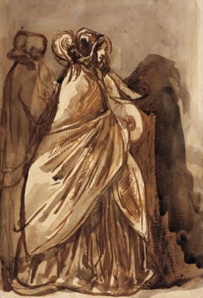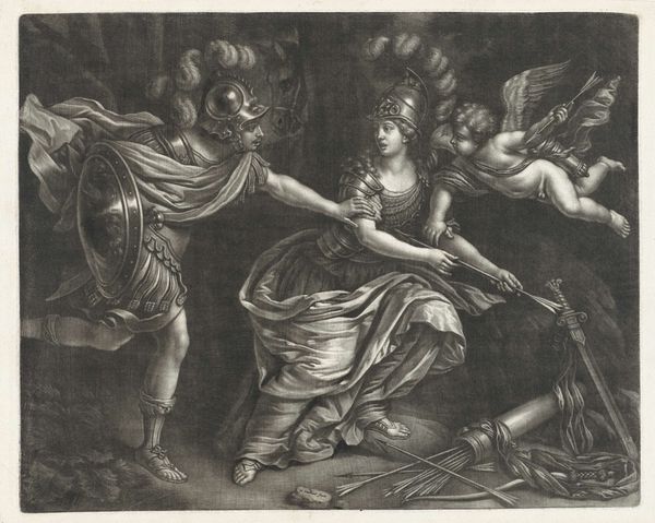 This is Henry Fuseli's dramatic interpretation of a scene from Shakespeare's Macbeth, rendered with oil on canvas. The composition is immediately striking: two figures are caught in a tense exchange within a claustrophobic, dark space. Lady Macbeth is depicted with an almost spectral quality, her flowing garments and gestures suggesting movement, while Macbeth cowers, trapped by the rigid bars of the picture frame. The stark contrast in light and shadow, a technique known as chiaroscuro, heightens the psychological drama. Lady Macbeth’s illuminated figure contrasts against the inky backdrop, drawing our eyes to her gesture. This creates a visual metaphor for the internal turmoil of the characters, destabilizing established notions of moral order and gender roles. Ultimately, Fuseli's work isn't just an illustration of a play, but a powerful commentary on the destabilizing effects of ambition and guilt, captured through the potent language of form and composition.