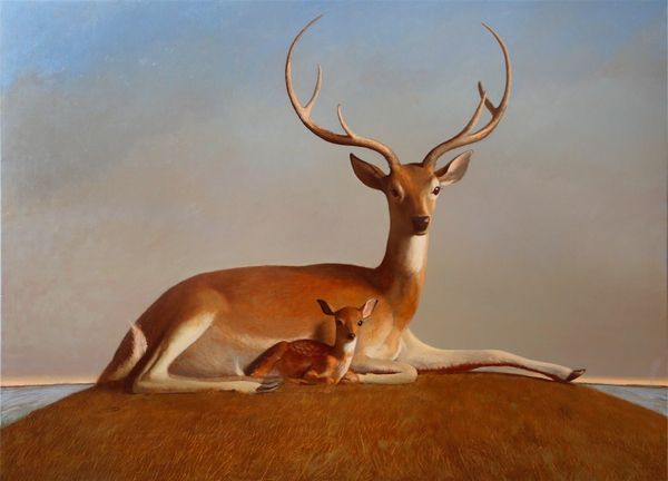 Arthur Fitzwilliam Tait painted this intimate scene of a doe and her fawns, rendered in oil, to capture the essence of maternal care. The deer, in many cultures, appear as symbols of gentleness and nurturing. Here, the protective mother and her young are depicted near a body of water. Reflect on the archetypal image of the mother and child, seen across countless epochs and civilizations, from ancient fertility goddesses to the Virgin Mary with the infant Jesus. The pose of the attentive mother, echoes in the animal kingdom and is deeply rooted in our collective consciousness. The image calls forth feelings of security and natural harmony. Consider the enduring cycle: deer appear in paleolithic cave paintings, evolving through mythology and religious art to appear in modern-day animated films. Tait's painting reminds us of the timeless connection between humans and the natural world, triggering deep-seated emotions related to family and preservation.
