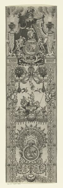 Curator: This highly ornamental engraving, dating from 1714, depicts the state carriage of the Duke of Ossuna. It’s by Bernard Picart, rendered in ink and engraving. What strikes you most about it? Editor: Its overwhelming, dizzying even! There's so much visual information packed into every square inch. It almost feels less like an image *of* something, and more like pure Rococo excess distilled into a black and white print. Curator: Absolutely, the Baroque style is alive and well here! Note the recurring cherubs and floral motifs. Consider the deeper symbolic resonances of this carriage beyond mere transportation. In some ways, it feels like an icon. Editor: An icon of power, certainly. The central cartouche, picturing what seems like a regal figure in a chariot pulled by swans...it evokes classical mythology. But placing it within *this* elaborate framework? That's all about earthly, rather than divine, authority, isn’t it? It screams status and importance. Curator: It does! The image uses inherited mythologies of power to bolster the Duke's image. And look at the edges – those densely layered floral patterns remind me of textile designs of the period. Picart really merges signifiers from multiple artistic forms here to reinforce the Duke’s prominence. Editor: And it speaks to the performance of power in that era, doesn't it? It’s about projecting an image, constructing a visual narrative of dominance. I can't imagine how extravagant the actual carriage must have been if *this* is just the depiction! Curator: I think you’ve nailed something very central here, that the image creates an artifact that becomes equally valuable to its referent, that performance. Its abundance echoes the social climate and hierarchies of the time, ossifying an elevated status and circulating it through the public sphere via printed images such as this. Editor: Looking at this, I get the sense that visual overload itself was a strategy to communicate power and prestige, what better way to have it expressed in such a carefully wrought engraving? Curator: I’ve also always read the sheer density as an armor in and of itself: the chaos prevents the viewer from seeing beyond a simple pronouncement of aristocratic force. This has been quite enlightening! Editor: Agreed. It certainly gave me a fresh perspective on Baroque ostentation and its role in constructing social narratives.