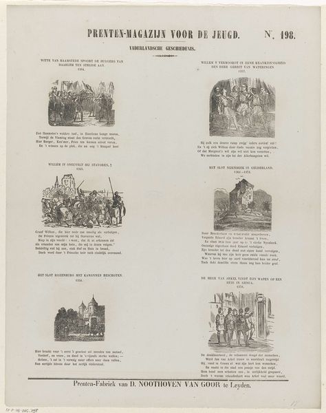 This lithograph by Jan Schuitemaker presents scenes from the reign of King David. Its visual impact lies in its sequential, comic strip-like layout, where each scene is neatly compartmentalized, narrative flowing linearly across the page. Consider the use of line here. Each scene is meticulously etched with fine, dense lines that create texture and shadow, which serve not just to illustrate but to also delineate space. Schuitemaker uses line to structure each panel, directing our gaze. The stark contrast between light and shadow further dramatizes each biblical story, underscoring the moral dimensions of the narratives. The use of text is also crucial; as a semiotic system, it anchors and directs interpretation. But what does it mean to depict biblical narratives in such a structured, compartmentalized format? Perhaps it reflects a broader cultural project of ordering and disseminating religious knowledge. The artist invites us to ponder how meaning is constructed through visual narrative and textual context.