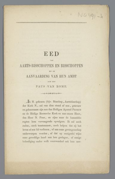 Curator: Immediately, I notice how understated it feels. It's like a quiet announcement, a formal declaration made with such simplicity. Editor: The work before us, "Konings-Verjaardag: een lied voor den 19den februarij 1861", is a printed piece from 1861 created by J.H. van Lennep. It seems to be a poster or perhaps a title page. The emphasis on typography is striking, isn't it? Curator: Strikingly restrained, yes. The negative space almost swallows the text. It creates this… solemn reverence, befitting a king's birthday, I suppose, but with a touch of melancholy. Editor: The layout employs varying font sizes and weights to establish a visual hierarchy. Consider the bold san-serif typeface used for "KONINGS-VERJAARDAG", its cap height far exceeding the body text. It certainly catches the eye. Then, the slight embellishment dividing the text block…it’s all so intentional. Curator: Absolutely, every element works to construct meaning. It isn’t just information; it’s a constructed statement. And look, “(Uitgegeven ten bate van de watersnoodlijders)” is included below the author's name— "(Issued for the benefit of flood victims)", in English translation. Editor: Ah, interesting. Proceeds were going to charity! I appreciate knowing that about the artwork’s history because you look at it differently. It adds some much-needed context that explains a lot of that… restrained energy. Curator: Indeed. That sense of solemnity now becomes infused with a deeper purpose. It's no longer just about celebration; it’s about communal responsibility and compassion in the face of disaster. Editor: It's interesting how the artist merged both royal reverence and human tragedy. So perhaps there is less melancholic air about it and a bigger human feel of empathy that translates through time from 1861 into our present. Curator: The longer one looks at it, the more layers one uncovers. Thank you. Editor: Absolutely. It's like uncovering a forgotten melody of our past selves, and for me that’s the magical thing.