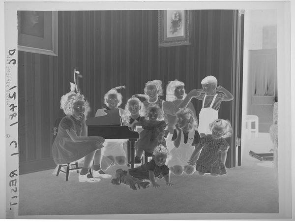 Editor: This fascinating photograph by Hamblin Studio shows a group of men in striped suits with musical instruments. It's titled "Untitled (men in striped suits, seated, with musical instruments)". The composition and medium create a very surreal mood. What strikes you about this piece? Curator: Considering the material process, it's interesting. The negative photograph allows a peek into the socio-economic context of studio portraiture. Who were these men, and what labor allowed them to commission this image? Are their striped suits a uniform, signifying a particular trade or social club? Editor: That’s a great point. I hadn’t considered the class implications of commissioning a studio portrait. Curator: Think about the materiality of the suits, too. Were they mass-produced, indicating broader shifts in textile manufacturing and consumption? The photograph prompts us to question the labor involved in its creation. Editor: I now see this image as a window into understanding social dynamics through the lens of its production. Thanks!