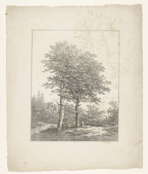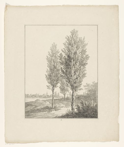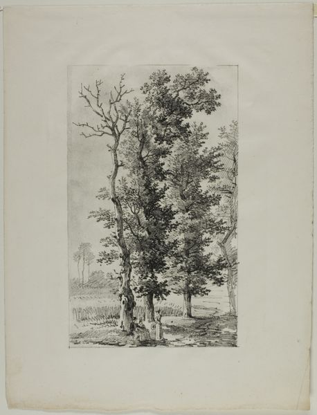 Editor: Here we have Adrianus van der Koogh's "Boom in Weiland," made in 1826. It's a detailed engraving, and I'm struck by the simplicity of the lone tree dominating the scene. It seems almost like a portrait of a tree, not just a landscape. What draws your attention in this print? Curator: The method by which this "portrait" came to be is fascinating. Think about the labor involved in creating this image. Each line meticulously etched, a repetitive action, transforms the metal plate into a matrix, ready for reproduction. The print becomes a commodity, accessible to a broader audience, democratizing the landscape. What does this shift in access imply about nature in 1826? Editor: That's a great point! I hadn't considered the accessibility of prints. So, instead of needing to commission an original painting, more people could own an image of nature. Did this change how people perceived the landscape itself? Curator: Precisely! Consider the paper, the ink, and the printing press itself – all products of industrializing societies. This image, seemingly depicting untouched nature, is deeply intertwined with industrial production and the economics of visual representation. Even the framing within the drawn border turns nature into a composed scene fit for viewing in the home. Are we, perhaps, consuming an idea of nature as much as the image itself? Editor: So, it's not just about the tree; it's about how the materials and processes used to create the image change our relationship with nature. The romantic idea clashes with the reality of production. Curator: Exactly. Van der Koogh isn't just depicting a tree; he's participating in a complex system of production and consumption that shapes our understanding of nature and landscape in the 19th century. What do you make of the tree, as opposed to mass production itself? Editor: It highlights the contrast between the idealized, singular tree, and the industrialized means of portraying it. The labor put into the making is masked to give way for something 'romantic', yet in essence romanticism here has industrialized roots. Curator: Indeed, and that contradiction is the crux of a materialist reading of Romantic landscape art. This gives much to consider! Editor: Absolutely! It makes you rethink what you are looking at. Thanks for this insight.