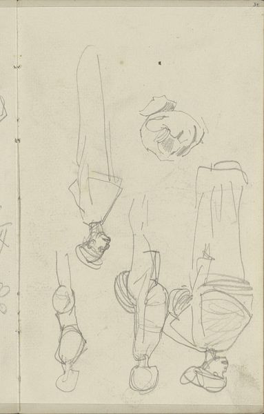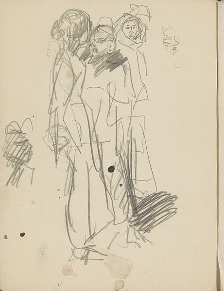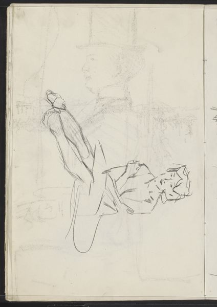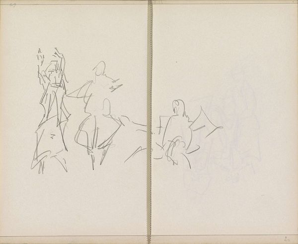 Curator: Welcome. We’re looking at George Hendrik Breitner’s "Figuurstudies en paardenbenen," which translates to “Figure studies and horse legs," dating back to the early 1880s. Editor: Immediately, it feels intimate, like sneaking a peek into the artist's private sketchbook. There's a charming rawness. Curator: Breitner certainly captures that with the directness of pencil on paper. Observe the layering of figures, the contrasting delicate and bold strokes. Notice how certain figures fade, emphasizing others. The formal elements – the lines themselves – dictate our gaze. Editor: But beyond the lines, I’m wondering about the social context here. Breitner was deeply embedded in Amsterdam’s urban life. These women – do they reflect the city's evolving roles for women at that time? What can we deduce from their garments? The sketches give clues, don't they, about the expectations, limitations, even the aspirations of these figures? Curator: Undoubtedly. Although his intention remains enigmatic, the precision he affords their carriage suggests something beyond mere sketches. I appreciate the repetition of profiles, how he's considering not just likeness but also the pure geometric shapes of their faces. Look how that bold eye with rays seems to watch from above. Editor: I'm also drawn to the depiction of horses' legs – disjointed. It begs a dialogue: What's the symbolic meaning when put alongside these figure studies? Does it reference labour? Does it show wealth and social mobility within the Netherlands? Curator: A tantalizing question, really! While Breitner offers no simple resolution, his artistic genius lets us experience his method and the medium. Pencil in its elemental form facilitates these transient, provisional insights. Editor: True. And seeing the evolution from sketches into finished portraits, it underscores that art isn't made in a vacuum. Each piece tells a story reflecting socio-cultural dialogues. Curator: Ultimately, it allows us to engage and scrutinize how art and society are, invariably, reflections of each other. Editor: An engagement further provoked by looking beyond the visible forms. What a compelling glimpse!