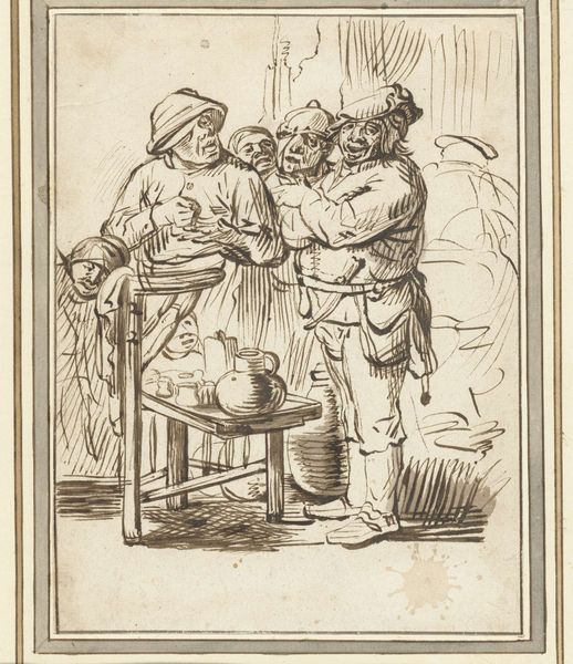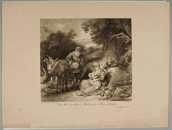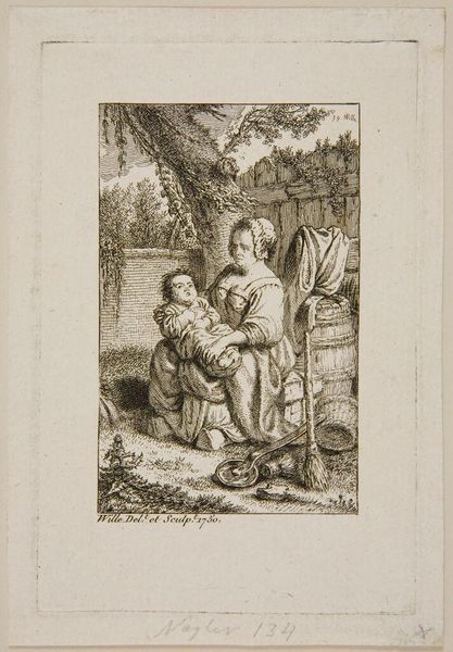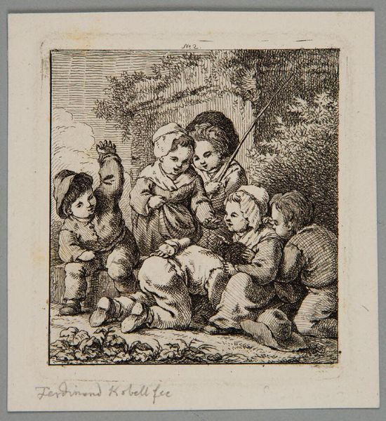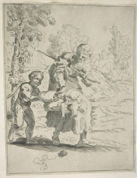 Curator: Ferdinand Kobell, who lived from 1740 to 1799, created this piece, "Two Boys and a Girl," currently held at the Harvard Art Museums. It seems like a pretty straightforward genre scene. Editor: Oh, it's immediately transporting! The light and shadow create a wistful atmosphere, like a half-remembered dream of childhood. The composition is so delicate, like a cobweb. Curator: Well, genre scenes like these were often commissioned by the bourgeoisie and gentry, who wanted to see idealized versions of rural life. It's a window into the values of that era. Editor: Idealized, maybe, but there is also something quite tender about the observation of those children. The way the light catches on the one boy’s hat… it’s got a melancholic charm. Curator: I agree the image evokes nostalgia. These prints were easily reproducible, helping to spread certain notions about childhood innocence and rural simplicity. Editor: Absolutely. And I love how the artist captured them seemingly lost in their own world. It’s like glimpsing a secret moment. Curator: A very carefully constructed secret! It's a lovely image, revealing how the rising middle class viewed itself and its world. Editor: Indeed. Art is such a portal, isn't it? It’s not just the beauty of the lines, but the echoes of a life and a time far away.