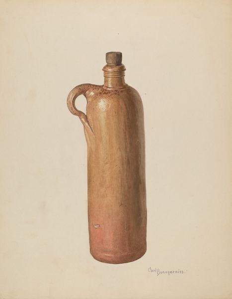 Editor: So, here we have Frank C. Barks' "Powder Flask," made around 1938. It appears to be primarily watercolor, charcoal, and pencil on paper. It’s striking how meticulously the details are rendered, giving this utilitarian object almost a jewel-like quality. How would you interpret this depiction? Curator: The fascinating thing here is how Barks elevates this functional item – a powder flask – through artistic labor. Consider the social context of the 1930s, a period marked by both mass production and a renewed interest in craft. Barks’ painstaking technique transforms this object of potentially violent use into something beautiful. Do you see any clues in the image of the possible role and status of its user? Editor: I notice the imagery etched onto the flask – a stylized animal with wings that seems almost mythical. Does that suggest anything about its owner or intended audience? Curator: Precisely. This isn’t simply about containing gunpowder; it's about displaying a certain status, a cultivated taste perhaps. Look at the materials used for the real object, the methods involved in its construction, the artisanal details like relief sculpture… all are choices, signaling luxury in some way, but the *re*production signals an engagement with those material realities on the part of the artist as well. Barks, in a sense, has entered into a kind of conversation about labor by the very act of creating this highly detailed and technically superb artwork. He asks us to reconsider traditional boundaries between decoration and violence, leisure and work. Editor: So it's not just about showing the powder flask but engaging with the ideas surrounding it, and almost fetishizing labour and making? That is an unexpected and intriguing perspective. Thanks for your thoughts! Curator: And thank you for prompting such interesting insights! It’s amazing what focusing on material processes can reveal about a work.