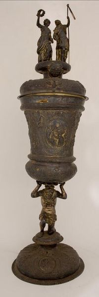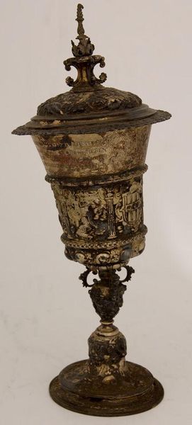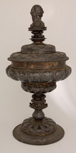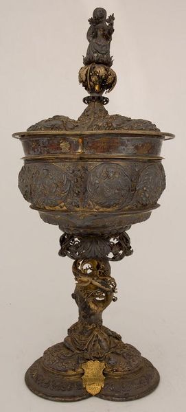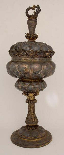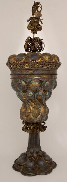 Editor: This is a replica of the Mölln Goblet, dated 1581. It's quite ornate. I'm curious about the historical context surrounding its creation. What stories might this goblet tell us about the society it came from? Curator: The Mölln Goblet represents a time of immense social stratification and political maneuvering. Think about sumptuary laws – who was allowed to own such extravagant objects? Who was excluded? Editor: So, it's less about the object itself and more about what it represents? Curator: Exactly. Consider the craftsmen, likely anonymous, and the power structures that enabled such artistry. Were they free artisans or working under a rigid guild system? Editor: This makes me rethink my initial view. It's more than just an object; it embodies the sociopolitical landscape of its time. Curator: Precisely. And by examining those structures, we can better understand the power dynamics at play.