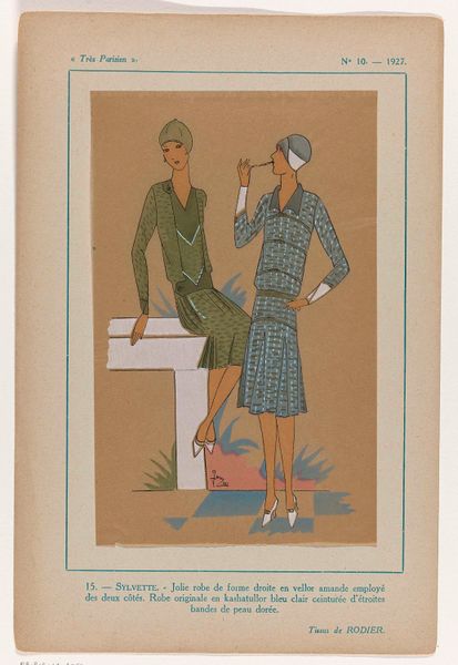 Curator: Ah, "Très Parisien, 1926, No. 2, Pl. 4: Créations PREMET - ALGER" by J. Dory. It's a drawing, watercolor, a lovely example of Art Deco. Editor: It is striking! I am immediately drawn to its simplicity and that soft, powdery blue. What catches your eye about this illustration? Curator: It's more than just an illustration; it's a window into a very specific moment. Consider the socio-political context. World War I had ended, and there was a sense of liberation and modernity. Women's roles were changing; they were gaining more freedom and agency, reflected in the streamlined silhouettes and travel. It’s a post-war visual declaration. How do you interpret the women’s garments in this context? Editor: I see what you mean. The looser shapes seem to signal less constraint compared to what came before. Curator: Exactly. And the title includes “Alger,” which alludes to the rising interest in global cultures. Art Deco often incorporated exoticized motifs. It’s not simply about style; it's intertwined with colonialism and the romanticization of other cultures, creating a dialogue between Paris and the world. Do you see any echoes of that interplay in the color palette? Editor: The contrast between the blue and beige suggests something of that tension. I never would have considered the colonial implications here. Thanks for this. Curator: The power of art history is unveiling how social narratives shape aesthetic choices! It certainly reshapes our appreciation, doesn't it?