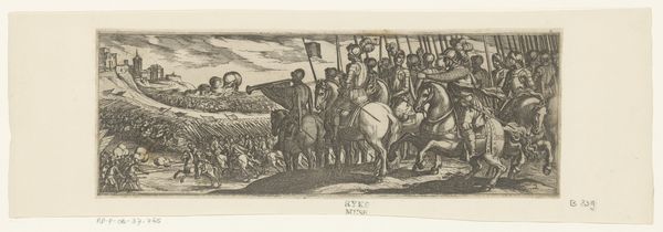 Curator: This is Bartolomé Maura's "The Surrender at Breda or 'Las Lanzas' (The Lances), after Velázquez," a drawing and print from 1876. It's currently held here at the Metropolitan Museum of Art. Editor: Immediately striking is the implied dynamism—a captured moment pregnant with larger narratives of conflict and power. The concentration of figures suggests a crucial interaction. Curator: Indeed. Maura recreates Velázquez's celebrated depiction of the 1625 handover of Breda. Considering this is a print, think about the process of reproduction; the layers of mediation transforming the original painterly gestures into lines etched into a plate, and then pressed onto paper. The accessibility that prints afford changes the relationship between art and audience. Editor: I am captivated by the composition itself: The receding lines of lances creating depth, drawing our eye into the heart of the exchange. And, how Maura uses hatching and cross-hatching to suggest depth, mimicking Velázquez's color composition from dark at left, to golden-yellow on the right—it gives the work movement and life, despite the limitations of monochrome. Curator: Absolutely. Furthermore, think about Maura's own social context: late 19th-century Spain grappling with its imperial past. The reproduction of such a heroic depiction of Spanish military victory served to remind viewers of that imperial project. It also points to a culture of art making based on older masterpieces. Editor: And while we are discussing visual language, consider how the lowered gaze and kneeling posture signal the Dutch commander's surrender while also imbuing Spinola with nobility, even magnanimity, which suggests something of the artist's perspective. Curator: Perhaps. But, through the material lens, we see Maura's print not merely as a tribute, but as a piece of cultural currency circulated within specific political and social economies. Editor: A powerful point. What this piece offers is not only a masterclass in technique and pictorial storytelling but it shows an exercise in strategic image-making as well. Curator: It's been fascinating to revisit Maura's print through both a consideration of its formal elements and its status as a cultural artifact. Editor: Agreed. Seeing "The Surrender at Breda" deconstructed with attention to process and composition heightens my appreciation for both Maura’s and Velasquez’s artistic choices.