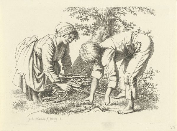 This is Jacob Ernst Marcus's drawing, Studieblad met een houtsprokkelaar en een man met zaag, made with pen in grey ink. The composition presents two figures engaged in the act of cutting wood, set against a sparse landscape. The figures are rendered with meticulous detail. Note the way their clothing folds and facial expressions are depicted, all with fine strokes of the pen. The limited palette of grey ink emphasizes form and texture, drawing attention to the linearity and precision of the drawing technique. Marcus uses hatching and cross-hatching to build depth and shadow, particularly noticeable in the rendering of the tree trunks and the figures' garments. The placement of the figures creates a balance, with one sawing and the other securing the wood, and their interaction forms a compelling dynamic. This work invites reflection on labor and representation, capturing a moment of human interaction with the natural world. It challenges us to look closely at the subtle ways an artist can convey narrative and meaning through form and composition alone.