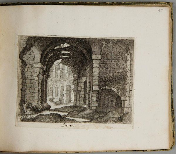 Editor: Here we have "Listesso," an etching attributed to Melchior Küsel. It depicts architectural ruins, very somber in tone. I'm curious, what feelings or ideas does this ruinous scene evoke for you? Curator: Well, it whispers of time's relentless march, doesn't it? Look at how the sky seems to cradle the broken arches. It’s almost like the past is breathing. Do you sense a story in those stones? Editor: I do, a melancholic one, of lost grandeur. Thanks for highlighting that! Curator: Absolutely, art is a visual poem, and ruins often write the most poignant verses.