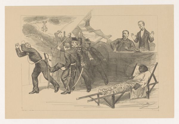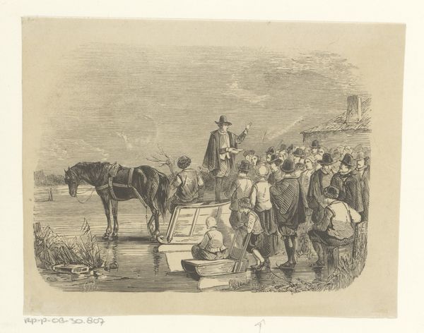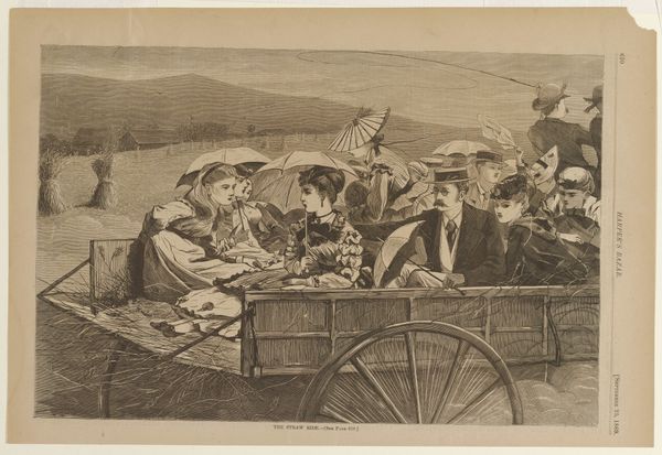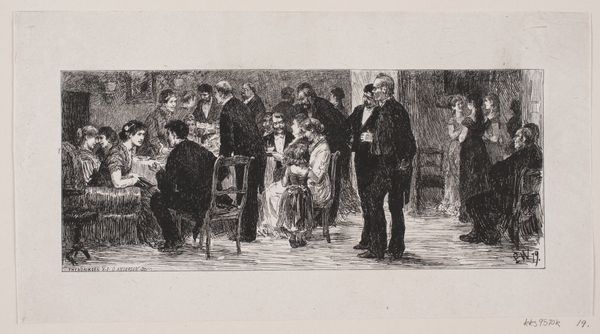 Curator: Winslow Homer's "Thanksgiving in Camp," an engraving from 1862, offers us a glimpse into a Union Army encampment during the Civil War, originally published in *Harper's Weekly*. It's a scene teeming with small dramas and quiet moments amidst a larger, ongoing national tragedy. What strikes you most about it? Editor: Honestly? The weariness. You can practically taste the dust and feel the aching bones in the slumped postures of these men. There's a communal aspect too, a makeshift attempt at normalcy through a holiday celebration, yet it’s underscored with an inescapable air of melancholy, you know? Curator: The depiction of that 'makeshift' Thanksgiving highlights the importance of maintaining cultural traditions during wartime. These soldiers, far from home, recreate familiar rituals as a form of psychological survival. The symbols are compelling; the humble campfire mimics a hearth, offering a focal point of warmth and connection amidst the harsh realities of conflict. It reflects how humans rely on familiar symbols during upheavals. Editor: Right, and it isn’t a grand, staged patriotic scene, which you might expect. It's… human. You've got soldiers huddled together, some writing letters, maybe trying to block out the noise, the smells... There's a profound sense of waiting—of suspended animation. It kind of creeps under your skin. Curator: The setting itself, a rudimentary camp, is potent with symbolic significance. Camps are by their very nature transient, uncertain spaces. Here, this contrasts sharply with the desire for continuity embodied by Thanksgiving. I am thinking about the table where a group is focused around some sort of game: do you think this could reference similar tableaus representing the Last Supper? Or even a courtly gaming scene? Editor: You know, the "Last Supper" imagery actually crossed my mind! Perhaps. And, you’ve nailed the 'uncertain' quality. But it all speaks volumes about resilience and adaptation. Curator: Yes! Through these humble rituals, like the figures near the fire brewing coffee, a semblance of order and community emerges from the chaos, echoing our innate need to define ourselves and the space around us, despite the turmoil. Editor: Ultimately, Homer captures the stoic grace inherent to this scene – the will to find comfort and meaning even in the shadow of profound trauma. The American spirit indeed. Curator: Precisely. It offers a poignant, enduring commentary on the human spirit, rendered in stark lines that resonate even today.