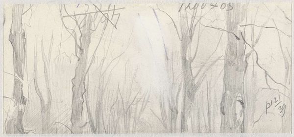 Editor: So, this is "Dennenbos," which translates to "Pine Forest," made sometime between 1867 and 1935 by Maurits van der Valk. It's currently at the Rijksmuseum. There's something about the texture that's captivating; it’s almost like a topographical map. What do you see when you look at it? Curator: I see a direct engagement with the materials themselves, both of the forest and the artistic process. This isn't just a representation of nature, it's an index of labor. Consider the time and skill involved in creating this dense network of lines. Editor: So you’re thinking about the artist's physical labor as part of the meaning? Curator: Absolutely. And consider the context: a burgeoning industrial era. The handcrafted nature of this work offers a stark contrast to mass production. We also might ask: what type of paper did the artist select, and how would that choice shape the image? The "rippled sketch texture," as the tags describe, also deserves special consideration. Does it echo larger artistic currents? Editor: That’s fascinating. It shifts my focus from just admiring the scene to thinking about the artist’s hand and the social implications. Curator: Precisely. How might the artist's own access to resources and materials have influenced the depiction of the forest itself? Think about deforestation, resource extraction… it's all connected. Editor: I never considered the connection between the industrial revolution and landscape art in this way. It encourages us to be more inquisitive when looking at these works, doesn't it? Curator: Indeed. It encourages us to consider the broader material conditions that shape both the creation and interpretation of art.