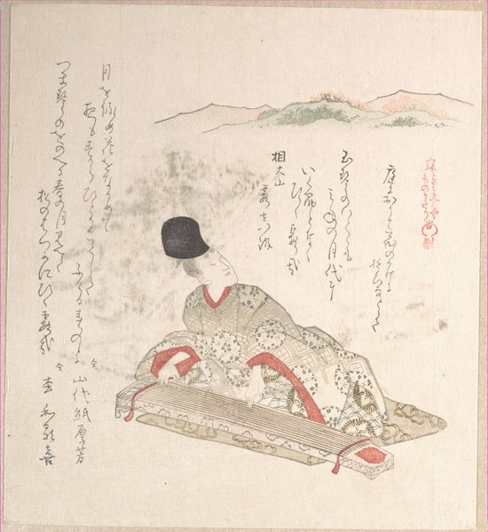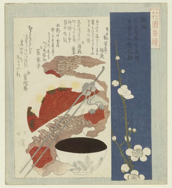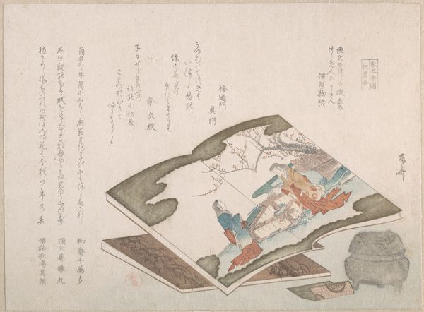 Curator: At the Rijksmuseum, we're looking at "Waaier en inro," a print made around 1822 by Totoya Hokkei. It’s a stunning example of ukiyo-e woodblock printmaking. Editor: My first thought is…layers! It feels like Hokkei is stacking moments in time or perhaps contrasting realms on top of each other in such a simple composition. Curator: Precisely. Look at the intentional placement of objects: the fan, the inro case, all meticulously arranged. Hokkei plays with texture using just a few blocks—the rough paper against the slick lines of the landscape is compelling. Editor: It makes me wonder what the dragon depicted on the case represents and its purpose in comparison to the idyllic scene constructed with such meticulous care. Does the scene bring balance or offer contrast? Curator: Ukiyo-e prints like this often alluded to popular stories or poems. In this artwork we notice calligraphic elements, the poem gives extra information about what we see: it suggests themes from landscape to a still-life that allows reflection and an interaction between nature and society. Editor: Nature and artifice blended like a beautiful whisper. It’s interesting, isn’t it, how Hokkei makes absence so present? The missing face, the unwritten narrative--we get the feeling these objects signify a whole world, not just a scene. Curator: That's what makes Hokkei's works endlessly fascinating. He gives us fragments, symbols that beckon our minds to fill in the blanks, crafting personal meaning each time we view the artwork. Editor: Yes, like capturing the mood of fleeting moment...a story left to each person. A little world inside a frame. Curator: A moment to be appreciated, just like those objects, fans, inro are part of daily life—a timeless daily life indeed.