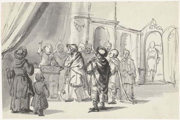 Wilhelm Marstrand created this watercolor wash drawing, depicting the 17th-century punishment of a counterfeiter, at an unknown date. The artist’s choice of watercolor wash, rather than oils, might be a commentary in itself. Watercolor is often seen as preparatory, or somehow less serious than oils, and perhaps Marstrand is suggesting a parallel between the deceptive act of counterfeiting and the deceptive possibilities of the medium. The application of the watercolor creates soft, flowing shapes, and a delicate, almost ethereal quality, which contrasts starkly with the serious and severe moment it depicts, where the tools of status, the chain and sword, are taken from the forger, Rosenkrantz. This adds another layer of intrigue to the scene. The artist uses the watercolor wash to capture the drama and emotions of the courtroom, from the king on his throne to the accused. The drawing reminds us of the importance of material, process, and context in understanding the full meaning of an artwork, and challenges the traditional distinction between fine art and craft.