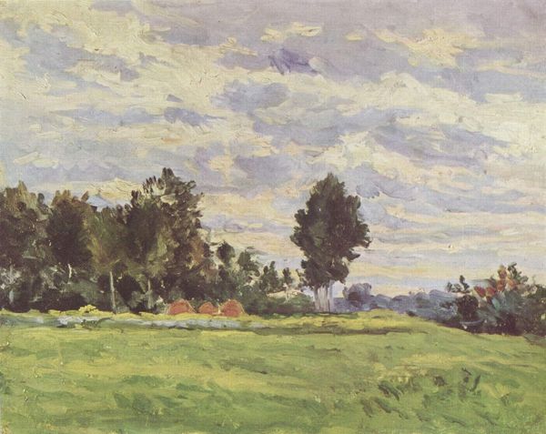 Editor: This is Algernon Talmage's "Landscape with Cattle" from 1917. It's an oil painting and it really feels like a breezy summer day, doesn't it? I love how the light filters through the trees. What do you see in it? Curator: Ah, Talmage. He captures a sort of pastoral contentment, wouldn't you say? The dappled sunlight...it almost vibrates with warmth. But look closer, what do you notice about his brushstrokes? Almost chunky in places, wouldn’t you agree? Editor: Yes! The impasto is really thick in areas, especially in the foreground. Is that typical of the Impressionists? Curator: It is, and it isn't. They each had their own language, of course. I like how the cattle almost blend into the landscape. Almost dreamlike...as if you're looking back at a hazy summer memory. You know, the Great War was still raging when this was painted. Perhaps a scene like this provided a moment of tranquility and normalcy. What do you think about that interpretation? Editor: That’s an interesting point, because it feels almost idealized. A refuge. So you think the chaos of war influenced how artists depicted the calm of nature? Curator: I wouldn't doubt it for a moment. This painting could be a love letter to the enduring beauty of the natural world, a whispered prayer for peace, or maybe just an escape for both the artist and the viewer. You see, the thing about paintings is that we find our own stories in them... like you and the breezy summer's day... Editor: That’s a lovely way to think about it! I guess what you find in art is always personal. Curator: Precisely! A conversation between the canvas and yourself.