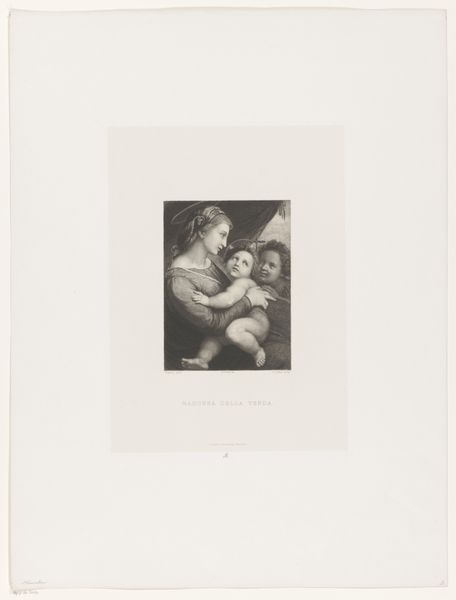 This is Johann Leonhard Raab's "Maria met kind en Johannes de Doper," created sometime in the 19th century, though the exact date remains unknown. Raab, working in a period of significant social change, presents us with a scene steeped in religious symbolism, yet rendered through the lens of his time. The figures of Mary, Jesus, and John the Baptist are not merely biblical characters; they are embodiments of ideals and values circulating in 19th-century European society. The Madonna, in particular, reflects the era's complex views on women - revered for her purity and maternal role, yet confined by societal expectations. Raab’s engraving invites us to consider the ways in which religious narratives intersect with the social constructs of gender, innocence, and devotion. It is a reminder that even the most timeless stories are constantly being reshaped by the cultural contexts in which they are told and retold. Raab captures something deeply human in this holy scene.