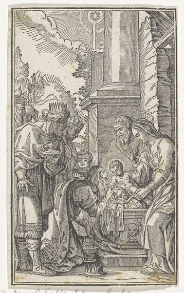 Editor: Here we have "Holy Family with Saint John the Baptist as a Child and Saint Elizabeth," an engraving by Joannes Galle from the 17th century, give or take. The detail is incredible. But overall, it feels, I don’t know… a bit stiff? What's your take? Curator: Stiff is one word for it. I’d say “formally posed with halos akimbo,” wouldn’t you? I wonder what those Baroque eyeballs were really looking at. It's like everyone has an appointment elsewhere! Perhaps we should consider it in the context of Galle’s profession as a printmaker rather than, say, Rembrandt's looser brushstrokes. Each line must carry so much meaning to justify its meticulous execution. Do you think the setting plays a part, as well? Editor: Definitely. That background castle on the hill is striking. Curator: Yes, Galle doesn't give it away so easily. Note how the strong architecture on the left balances with that distant structure. The whole piece becomes a testament to stability and order... though maybe a bit much for my modern tastes. What’s really fascinating is to think about how an image like this would have been disseminated and understood in its time. It becomes a vessel to carry these familial archetypes. Editor: So, it’s less about emotional expressiveness and more about conveying established ideas, maybe? Curator: Precisely! Galle’s work presents the ideal of holy unity with the deliberate hand of an expert engraver, ready for the printing press. And it worked… we're still talking about it today. Editor: I see it now. Thanks! I was expecting something deeply moving, but it's powerful in a different way, more… iconic, almost like a well-designed logo. Curator: Exactly. These aren't photographs, are they? Consider them carefully constructed advertisements for an ideal! That reframes the perceived stiffness entirely, doesn’t it?