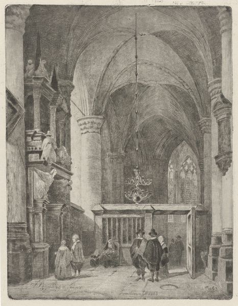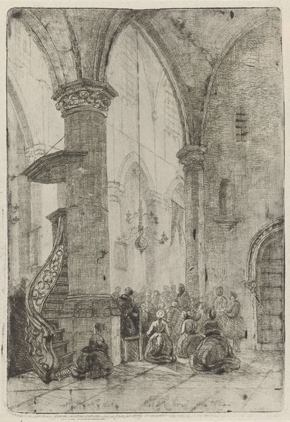 Adrianus Wilhelmus Nieuwenhuyzen created this etching, "Kerkinterieur met kerkdienst," which translates to "Church Interior with Church Service." The architecture immediately draws the eye—the pointed arches and vaulted ceilings. The space looms, filled with congregants, and a preacher elevated in his pulpit. The congregation, heads bowed in reverence, reflects a tradition deeply rooted in communal religious experience. This recalls ancient forums, and the role of the orator in shaping public consciousness. The act of gathering under a shared belief echoes through time. Consider the pulpit, not just as a physical structure, but as a stage. It is a place where words transform into a potent force, reminiscent of ancient oracles delivering pronouncements from on high. The architectural lines push upwards, seeking the heavens and connecting the earthly to the divine. This image is not merely a snapshot of a church service, but a potent symbol of humanity’s enduring quest for meaning, rendered in lines and shadows, ever in flux.