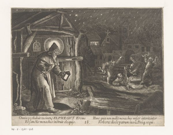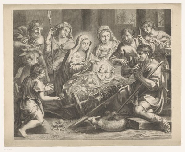 Curator: Here we have Raffaello Schiaminossi's "Birth of Christ," an engraving created between 1602 and 1604, part of the Rijksmuseum's collection. Editor: The mood strikes me immediately. It's reverent, but also curiously subdued. The dense lines give everything a somber weight. Curator: Let’s observe how Schiaminossi uses line—it’s almost obsessively detailed. Note the texture he creates, even in the halos. The composition, with its strict organization around the manger, directs your gaze inexorably to the infant Christ. It exemplifies a clear, structured approach characteristic of Italian Renaissance engraving. Editor: Absolutely, the light radiating from the child acts as a central point, surrounded by so many symbols. The angels represent heavenly grace. Mary and Joseph are humility and parenthood, while even the ox and ass were thought to represent the Jews and Gentiles. Even in the shadows, Schiaminossi layers familiar elements. Curator: And observe the economy of the figures, the controlled depth of the pictorial space, everything speaks to the structure informing it. The engraving focuses our eyes—and subsequently, our minds—on the geometric order the engraver saw in his vision of the divine. Editor: The lines of the thatched roof seem to funnel divine light downwards, enveloping the Christ child, making him even more luminous. It's like an arrow that leads straight to what he thinks matters most, the start of this profound, hope-filled chapter of the Bible. It connects to how this story, as a foundation of Western society, plays out even today. Curator: You could say the formal control facilitates this deeper reflection? The piece demonstrates a visual theorem: piety meticulously rendered for maximum impact. Editor: Precisely. Its iconographic elements weave into our cultural memory to deepen an enduring, universally recognized narrative. Curator: Looking at it purely from a craft perspective, this is masterfully and cleverly wrought from very few materials. Editor: For me, considering the print’s use of religious symbols shows the persistence of the story through all eras of art.