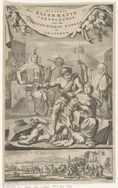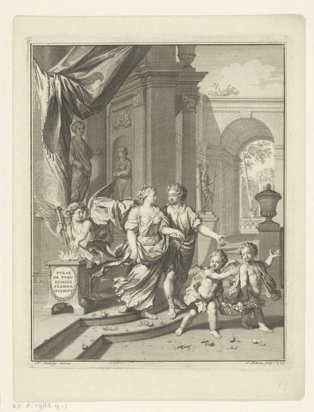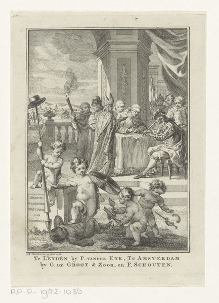 Editor: Here we have François van Bleyswijck's 1740 engraving, "Paulus onthult Mozes" housed in the Rijksmuseum. There’s a performative quality to it, like a dramatic reveal on a stage. I'm struck by how much text is integrated directly into the image itself. How do you interpret this work, given its historical context? Curator: It’s critical to understand this piece as part of a larger intellectual and religious struggle. This image participates in a very specific tradition of theological debate. Consider the tension: here, Paul is *revealing* Moses. Think about the power dynamics inherent in that gesture: who has the authority to interpret sacred texts, and how are those interpretations used to shape social and political landscapes? What does it mean for one figure to essentially unveil another, and who benefits from this supposed clarity? Editor: It's almost as if Paul is claiming a deeper understanding, a privileged access to Moses's original intent. I also noticed the backdrop has the look of an actual theater. Is there a reason for that choice? Curator: Absolutely. Think about the theater as a space for constructing narratives and ideologies. By staging this scene theatrically, Bleyswijck isn’t just illustrating a biblical moment. It seems like the performance and the book seller who made this print for Rotterdam. The visual culture served religious and potentially, sectarian interests. Editor: That’s fascinating, I never considered the theatre connection so explicit. Curator: Precisely. Reflecting on the piece now, the work asks critical questions: how art can either support or challenge existing religious hegemonies.