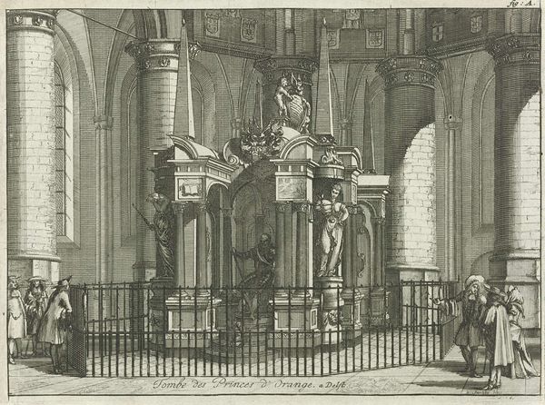 Curator: Here we see "De graftombe van Willem van Oranje, 1623," or "The tomb of William of Orange, 1623," by Nicolaas van Frankendaal, dating somewhere between 1730 and 1791. It's a print, a pen drawing in ink, likely an engraving too. My immediate impression is how monumental it appears, even in this small format. The artist masterfully captures the grandeur of the tomb within the Nieuwe Kerk in Delft. Editor: Grandiose is exactly the word that comes to mind. Look at all those architectural flourishes! The columns, the statues…it’s almost theatrically elaborate. You can practically feel the weight of history bearing down on you. I wonder about the intent. Curator: Its intent, I suspect, was very deliberate statecraft. William of Orange was a pivotal figure, a leader in the Dutch Revolt. Representing his final resting place with such pomp served to solidify his legacy and reinforce the power of the House of Orange in the Dutch Republic's political landscape. It projects legitimacy and permanence. Editor: The visual symbolism here is striking. Each figure on the tomb seems to represent different virtues and values of his reign. Perhaps the military strength or even the embodiment of Dutch liberty. I see symbols which feel simultaneously like defiance and nobility. Curator: Precisely. And note how the tomb is situated within the church. The religious context adds another layer, linking William of Orange to divine purpose and sanctioning his role in the nation's formation. The positioning reinforces the church’s support and places Orange into a divinely inspired historical arc. Editor: It certainly elevates him. The artist captured something far beyond mere commemoration. It serves as an altar to Dutch identity. Viewing it through this lens brings into focus how powerful iconography is to shaping the narrative, or perhaps legend. Curator: Exactly. We see the tomb transformed into a powerful emblem of statehood, faith, and the enduring legacy of leadership in Dutch national consciousness. Editor: Indeed. Reflecting on this artwork makes it evident how places of remembrance serve as constant reminders and tools for shaping identity. It's not just history recorded but history actively sculpted and conveyed.