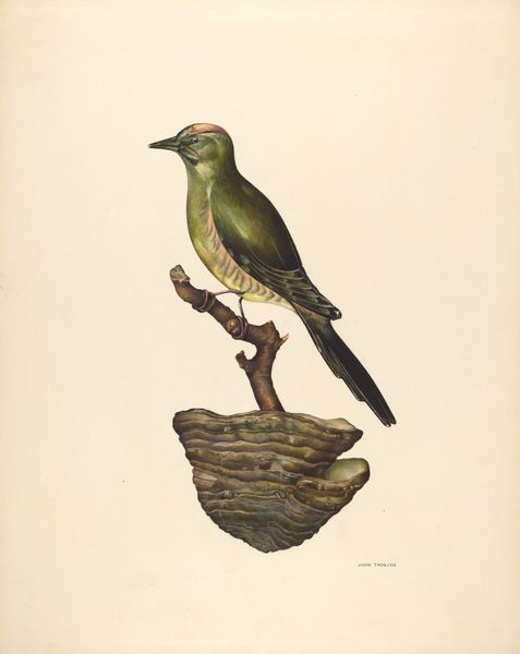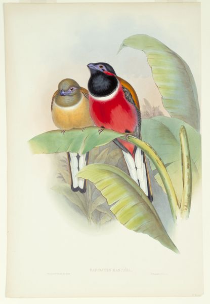 This lithograph titled, Plate 54, was created by John Gould, an English ornithologist and bird artist. In this composition, Gould presents us with two birds perched amidst foliage, dominated by verdant and muted earth tones, which sets a serene stage. The chromatic arrangement, where the green of the foreground bird contrasts with the softer blue of the one behind, creates a visual hierarchy. Gould's precise rendering invites a semiotic reading of nature itself. Each feather and leaf becomes a signifier, pointing beyond its material existence to broader concepts of beauty and scientific observation. The lithographic technique, with its capacity for detailed reproduction, aligns with the scientific ambitions of the time, aiming to capture nature's truth. Notice how Gould balances aesthetic appeal with scientific accuracy. This dual aim challenges the artificial separation of art and science, suggesting a more integrated understanding of the natural world.