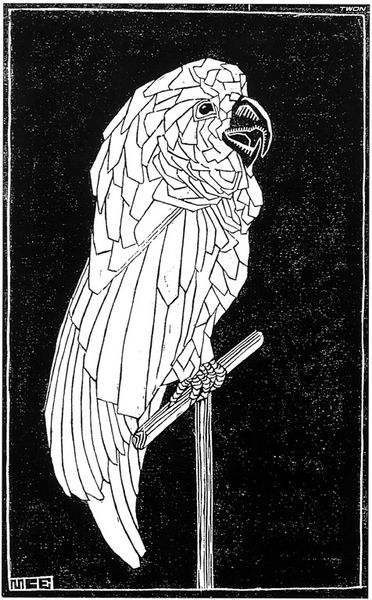 Editor: So, we’re looking at M.C. Escher's “Flor de Pascua - The Weathercock” from 1921, a woodcut print. The contrast between black and white really makes it pop. What strikes me is how stylized it is. What do you see in this piece? Curator: From a materialist perspective, I'm interested in the process of its creation. This is a woodcut, right? Think about the labour involved: the artist carefully carving away at the wood, embracing the inherent limitations of the medium. It forces a simplification of form. Look at how the hatching suggests depth in the sky. Editor: Definitely. I hadn’t considered the physical act so much. Does the woodcut medium say anything about the social context of the art itself? Curator: Absolutely. Woodcuts were a popular and accessible printmaking method in the early 20th century. Unlike oil paintings that might signal elite patronage, woodcuts enabled broader dissemination of images to a wider audience. How do we reconcile this form's connection to mass production with art's perceived value and scarcity? Consider this against a backdrop of increased industrialization. Does this imagery represent the growth and change? Or the past? Editor: Interesting, so the choice of woodcut speaks to the democratization of art in a way. I see now the lines look manufactured but were not made by a machine! I assumed this to be related to the era's mass media production but it has older roots. Curator: Precisely. The deliberate engagement with craft is what defines art outside traditional boundaries, and makes it more than a simple, readily produced piece. We learn that the artist may be reacting against the machine rather than just leveraging them! Editor: That really shifts my perspective on the work. I was so focused on the stark imagery, but understanding the labour behind it is essential. Curator: Right, thinking about the materiality changes how you perceive this piece of art in culture. The act of physically cutting into wood to produce this is a deliberate choice, a dialogue about material and societal transformation of craft.