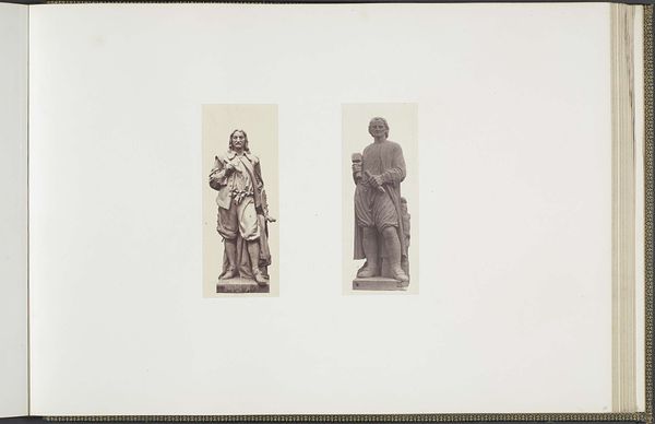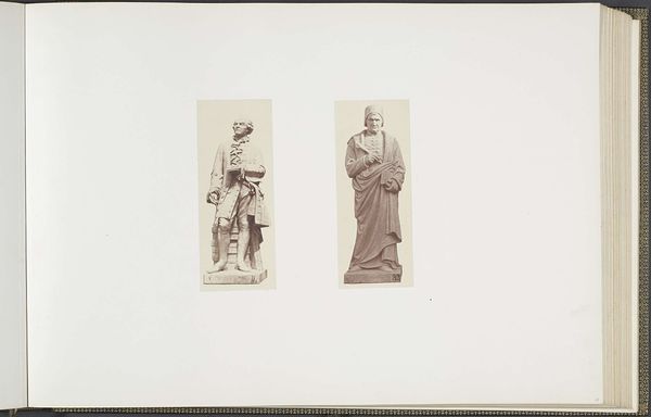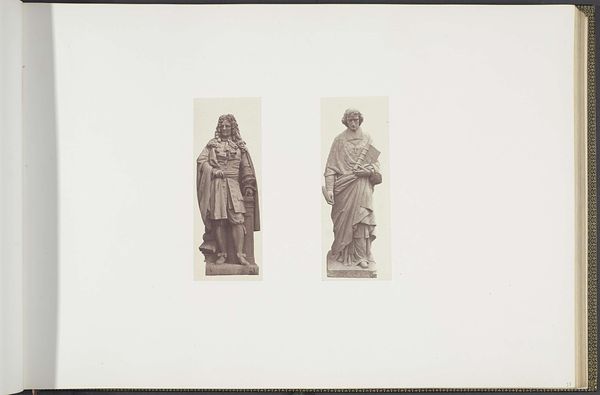 This photograph by Edouard Baldus presents plaster models for sculptures intended for the Palais du Louvre. The composition, defined by the stark contrast between the detailed models and the expansive blank space, draws our attention to the formal qualities of the sculptures themselves. On the left, "La Musique" exhibits a playful asymmetry, with instruments and cherubic figures swirling around a central form. To the right, "L'Art Assyrien" contrasts this with a stately, seated figure holding a tablet, embodying a more rigid, authoritative posture. Baldus's photograph prompts a consideration of how these models, rendered in a uniform tone, negotiate the space between original artistic creation and its photographic representation. What is revealed through the interplay between sculpture, photography, and the architectural ambition of the Louvre itself? The photograph exists not merely as documentation but as an invitation to consider the nature of artistic representation, cultural memory, and the construction of value.