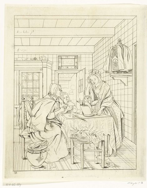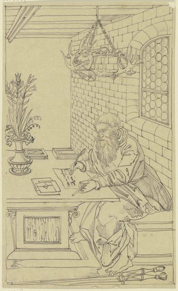 This pen and watercolor drawing presents a scene of focused industry; a man writing at a long table. The sketch likely comes from sixteenth-century Europe, a time when the rise of literacy, the print revolution, and new forms of bureaucracy were transforming society. The act of writing, once confined to religious and aristocratic elites, became increasingly common among merchants, professionals, and even some artisans. The image creates meaning through its intimate portrayal of a private, domestic interior. The man’s clothing indicates that he is most likely a member of the emergent middle class. The room's furnishings, while not lavish, suggest a degree of comfort and stability. It offers a glimpse into the spaces where knowledge was produced and disseminated. The composition draws attention to the tools of writing, such as the inkwell, quill, and stacks of paper. To fully understand the drawing, one would need to consult a range of historical sources, including studies of literacy rates, the history of the book, and the material culture of early modern Europe. Only through a consideration of such social and institutional contexts can we hope to understand its significance.