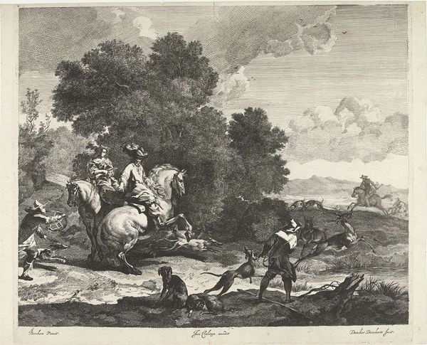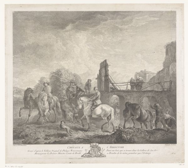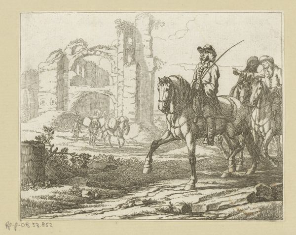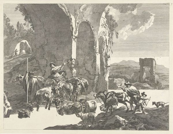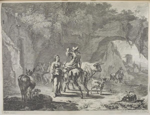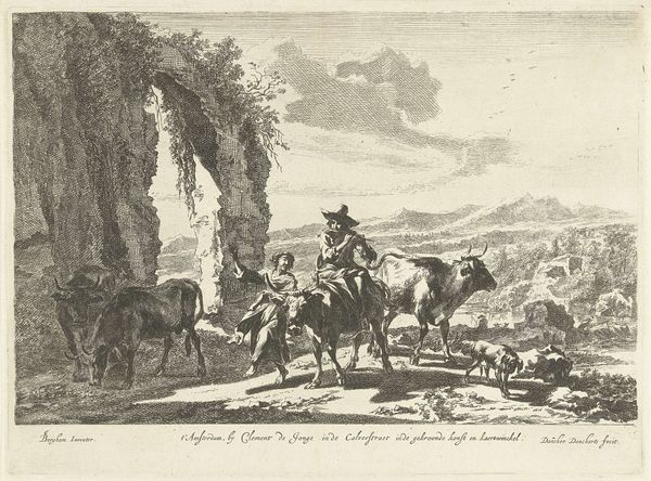 Dancker Danckerts created this print, titled "Avond: herder bij herberg in rots," using etching sometime in the mid-17th century. Etching is an intaglio printmaking technique, where lines are incised into a metal plate using acid. The plate is covered with a waxy substance, through which the artist scratches an image. The exposed metal is then bitten by acid, creating the recessed lines that hold ink. Ink is applied, the surface wiped clean, and then the print is made by pressing paper against the plate. Danckerts was one of a large family of printers and publishers active in Amsterdam during the Dutch Golden Age, which was a period of unprecedented urban expansion and international trade. Looking at the image, consider the relationship between the natural world, the laboring classes, and the consumption of art, as the lines etched into this plate offer a glimpse into the intersections of labor, pastoral life, and the art market in 17th-century Netherlands.