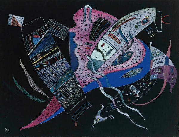 Editor: This is "La Forme Blanche" by Wassily Kandinsky, painted in 1939. It’s a painting that, at first glance, feels quite stark because of its dark background. What strikes me most is the interplay of geometric shapes and the textured white form that seems to float in the composition. What do you see in this piece? Curator: The power of this canvas resides precisely in that interplay, wouldn't you agree? Kandinsky orchestrates a delicate tension between the grounded darkness and the ethereal white form. Observe how the geometric figures—triangles, rectangles, circles—aren't merely scattered; they're meticulously positioned to create a dynamic visual rhythm. The "white form" itself, broken into smaller units, interacts with its darker sibling like notes in a musical composition. Does it suggest to you an argument? Editor: An argument... Interesting! I was focused on the shapes. So you're suggesting the contrast is key? How does the materiality – the paint itself – contribute to this? Curator: Precisely. Consider the texture within the shapes. Notice the varied application of pigment and surface patterns which introduces another layer of complexity, setting them apart. The color selection is intentional; how does the contrasting value amplify its structural dimensions? Editor: I see. The bright, clear colors really pop against the background, giving each shape a distinct presence and role in the composition. This makes them even more critical, each placed in the most optimal position for visual intrigue. Curator: Precisely. Kandinsky invites us to move past conventional representational modes of art to experience a unique formal configuration. I believe this careful formal exploration elevates Kandinsky’s work, regardless of the piece’s symbolism. It is his technique in orchestrating a dialogue between color, line, and form, the materiality of the pigment itself, that constitutes its meaning. Editor: So it's all about how those elements interact within the frame? Focusing on form alone, regardless of external meaning. Thank you. Curator: Exactly! Examining these components permits a richer reading and response to an art experience.