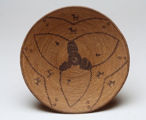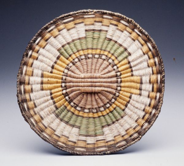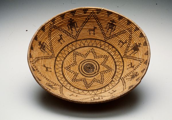 Curator: This intricate basket, created by an Indé (Apache) artist around the 20th century, showcases stunning weaving techniques. What strikes you first? Editor: Immediately, I'm drawn to the craftsmanship. The evenness of the weave, the tightness—it speaks to incredible skill and labor. What can you tell me about the materials and processes? Curator: Woven earthenware represents a bridge between functional object and art form. Considering this piece through an Indigenous lens, it symbolizes a complex interplay of utility and spirituality. How do you see that intersection reflected? Editor: The basket presents the concept of value and skill linked to this culture, emphasizing not just function, but social dynamics. This pushes against conventional categories separating "high art" from functional craft. What is the potential connection to gendered labour? Curator: Absolutely, these skills and labor typically are a women's domain within Indé society, speaking volumes about the economics of the communities and its legacy in social structure. The inclusion of geometric patterns further signifies coded forms of information within tribal structures. Do these geometric forms speak to these elements? Editor: Definitely. While seemingly decorative, they underscore an understanding of cultural narrative, memory and community embedded in functional items. In other words, this challenges our assumption that a basket only performs functional labor, that rather labor also holds embedded narrative content and collective effort. Curator: Exactly. It prompts us to question who gets to decide what's "art" and how historical power imbalances have often marginalized Indigenous artistic expressions. And those power imbalances manifest in representation, which brings me back to this work. Editor: Placing this basket within the social frame pushes me to reassess not just our interpretation of labor, but also of material culture, asking "what counts", for whom and how do we value non European modes of artistic and cultural production. Curator: Understanding how objects like this basket embody historical context, cultural significance, and resistance enriches our contemporary view of art. Editor: And understanding materiality provides an acute understanding of the labor required to produce an artistic object and how those histories and modes of production intersect in our understanding of material culture.