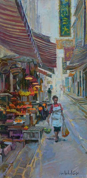 This painting, 亮色新古街, is built from bright colours laid on with thick impasto, probably with a palette knife. It’s an exercise in seeing how much abstract expressionism you can get away with, while still suggesting a street scene. There’s a push-pull between the marks and the subject matter, because when you look closely, you can see that each dash and stroke has been thoughtfully placed, not randomly. The overall effect makes me think of an early Van Gogh, someone like, say, Kees Van Dongen. Both artists used a similar technique, capturing light and atmosphere with thick brushstrokes of oil paint. The way the brushstrokes build up texture, particularly on the rooftops, gives the painting a tactile quality. You can almost feel the weight of the paint, and that feeling gives the painting its own peculiar reality. It's as if Wang Xin-Fu isn't just showing us a street, but also how he's constructed his experience of it, one loaded brushstroke at a time.
