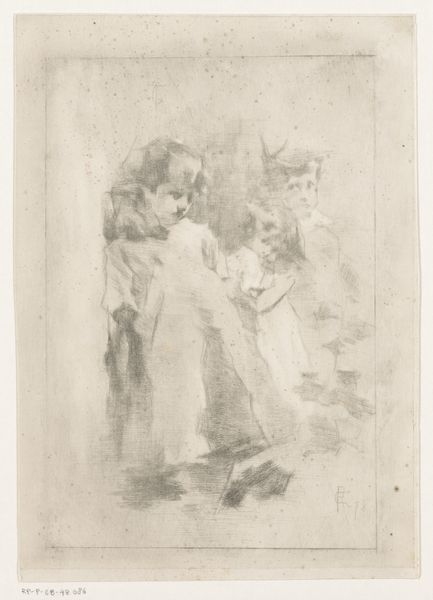 Editor: This is "Drie pootjebadende kinderen," or Three Children Paddling, a pencil drawing made sometime between 1874 and 1927 by Johan Antonie de Jonge. It feels quite ephemeral, almost like a memory fading at the edges. What catches your eye, looking at it? Curator: The grouping of figures, the children together in this liminal space between water and land…it feels timeless, doesn’t it? I see echoes of ancient bathing rituals, votive offerings to river gods, the symbolic cleansing and renewal inherent in immersion. Editor: That’s interesting, I was mainly focused on the Impressionistic style and technique. But I see what you mean, there is something primal about it. Curator: Notice how the artist uses line – the repetition in their striped shirts, echoing the ripples in the water. What could that signify? Perhaps social belonging but also the mirroring between the human world and the natural one? Editor: It almost blends the figures into the water. Are you suggesting that childhood is inherently linked to nature? Curator: Perhaps, but also think about how water is used symbolically. In many cultures, it signifies purification, transition, even danger. Look at their downward gazes; are they contemplating their reflection or the future? What stories do you imagine? Editor: I still see carefree play, but you've given me a lot to think about, especially that sense of the symbolic weight of the water itself. I definitely see it in a new light now. Curator: And I appreciate your perspective as well – reminding us that even in the deepest symbols, there is a playfulness to be found, just beneath the surface.