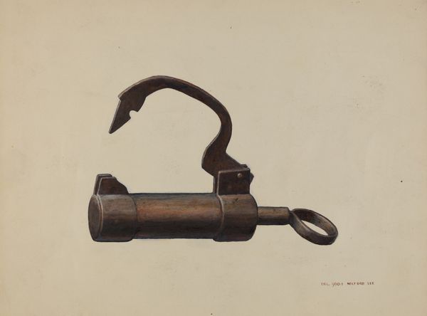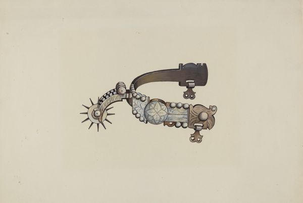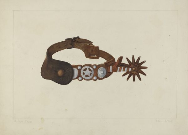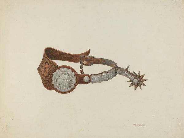 Rose Campbell-Gerke made this beautiful drawing of a spur, date unknown, using what looks like watercolor or gouache on paper. There's something very satisfying in the way the artist has rendered the object's textures and materials, from the tooled leather, to the matte metal, to the shiny silver. It’s fascinating how Campbell-Gerke's mark-making describes the form so economically. Look at the rendering of the silver disc. Notice the subtle gradations of tone that suggest a curved, reflective surface. There’s a combination of hard, precise lines, and soft, blended washes which is quite beautiful. The color is muted, and earthy, creating a sense of authenticity. This kind of representational drawing is a world away from my own work, but I find myself really drawn to the precision, and patience involved. It reminds me a little of the work of Vija Celmins, with her meticulous depictions of everyday objects and natural forms. But also of Charles Demuth, with his sharp focus on shape and form. Art is a big conversation, and it's always exciting to see how different artists approach the challenge of representing the world around them.