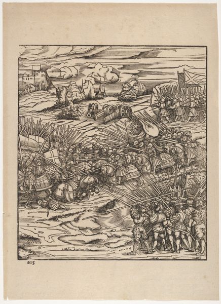 Curator: Just look at the density of this image! What's your immediate impression? Editor: Chaos, plain and simple. There’s an awful lot going on; violence and intensity certainly dominate the scene. Curator: That's definitely evident. We're looking at "Battle scene with a man about to be stabbed with a sword at lower right," a work made around 1730, by Jan Caspar Philips. It's a print, an engraving in ink. Editor: You know, examining the engraved lines and considering Philips's labor-intensive process, one might ponder the distribution and consumption of these images. Prints like this could disseminate narratives widely, shaping public opinion and awareness of historical or political events. How do you see it working? Curator: I see the function of an easily distributable image shaping collective memory of conflicts; it clearly served a public role, perhaps reinforcing national identities. Notice the architecture and naval ships in the distance and how Philips situates the violent confrontation within a larger geographic context. Editor: I’m fascinated by the contrast between the idealized depiction of conflict – you know, the heroic gestures – and the sheer brutality rendered in such a reproducible format. Was this designed for mass consumption or targeted toward a specific social class? Curator: Prints were an affordable art form during that period. Philips also had patrons he probably sold to so likely, its consumption wasn't as narrow as you might expect. How does it strike you from an aesthetic standpoint? Editor: The composition definitely guides the eye through the action—the figures intertwine and overlap. The scene captures so much with so little materially, but it's all about how many were made and seen, and what messages that promoted. Curator: I agree. Studying an artwork like this makes me contemplate not only artistic skill but how power and ideology circulated through visual culture. Editor: Right, understanding its social context and how Philips created his pieces makes me consider how institutions have both supported and been impacted by this kind of material.