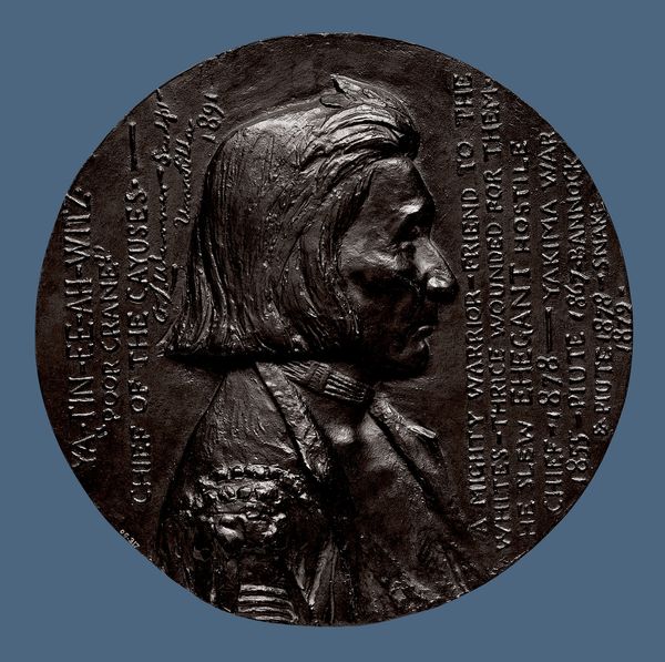 Olin Levi Warner created this bronze medal, N-Che-Askwe, Chief of the Coeur d'Alenes, in 1891. The medal portrays a profile of Chief N-Che-Askwe, a leader of the Coeur d'Alene tribe, set against a plain background with inscriptions of his name and title. This artwork reflects a broader cultural interest in depicting Native American leaders, but it simultaneously raises questions about representation and power dynamics during a period of westward expansion and displacement of indigenous peoples. The choice of bronze, a material often associated with commemorative and historical works, suggests an attempt to preserve the image and legacy of Chief N-Che-Askwe. However, such artistic endeavors often occurred within institutional frameworks that were shaped by colonial perspectives. Understanding the historical context and the artist's motivations requires consulting archives, ethnographic studies, and indigenous sources. By doing so, we can better interpret the complex layers of meaning embedded in this portrait medal.