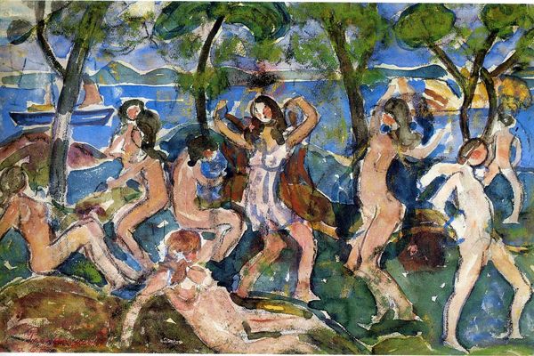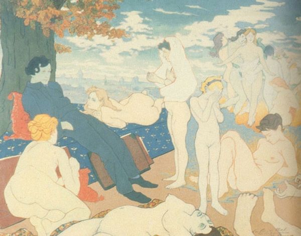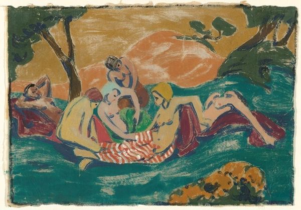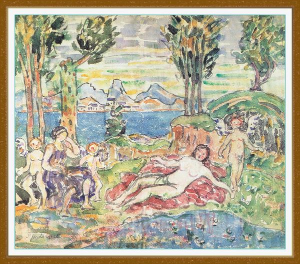 Editor: This watercolor by Paul Gauguin, "Te arii vahine," from 1896-1897, feels both peaceful and a little unsettling. There’s this dreamy landscape, but something about the central figure's gaze makes me question what’s truly being depicted. How do you interpret this work? Curator: That sense of unease is perceptive. Gauguin's work is deeply implicated in the colonial narrative of its time. While ostensibly celebrating Tahitian life, paintings like this, need to be examined critically within the power dynamics of colonialism and its impact on the Tahitian people. Look at how the woman's body is presented. Do you see any possible issues related to the male gaze or exoticism? Editor: Well, she's nude, which, given the context, definitely complicates things. I guess it makes her vulnerable but is it a truthful depiction, or is he imposing a Western view? Curator: Precisely. Consider also the title – "The Princess." Is that an authentic Tahitian understanding of the figure, or a projection of Western ideas of royalty and exoticism onto a culture Gauguin only partially understood? His works romanticize the exotic at the expense of representing Indigenous perspectives accurately. Editor: So it is almost a fantasy, using Tahitian culture as a backdrop? I hadn't considered that interpretation. Curator: Exactly. Examining the artist's intentions in conjunction with the historical impact of his representation opens the artwork up to discourse. It compels us to consider how art can be both beautiful and deeply problematic when it reinforces asymmetrical power dynamics. Editor: I see what you mean, it completely reframes how I view the piece now. It is not a simple landscape anymore! Curator: That tension is important. By engaging critically, we acknowledge the complexities of Gauguin's work and confront its role in perpetuating certain stereotypes. It pushes us toward a more nuanced, socially conscious understanding of art history.