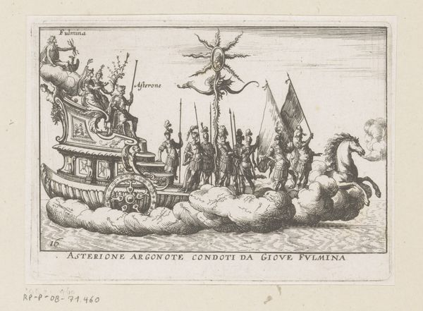 Curator: This print, titled "Ship with Argonauts and Tethys", dates to about 1635 and we attribute it to an anonymous artist. It's an engraving, and it’s currently held here at the Rijksmuseum. Editor: It has a strange sense of regal power, even for such a small engraving. The composition, all lines and precise detail, almost feels overwhelming with all these figures. I see gods and soldiers together on this vessel. What do you make of it? Curator: Given that the print portrays a boat laden with classical figures, it seems a likely subject would be to interrogate how concepts of leadership, class, and divinity intertwine and justify sociopolitical hierarchies during that era. Who had access to these stories and visual representations? How did this artwork justify those power structures to different audiences? Editor: Well, considering its context within the rise of Baroque style, it makes sense. I think of absolutist rule during that time and all the aristocratic associations that come with the idea. I see classicism used here as a means of claiming authority, right? A way of legitimizing through inherited traditions. Curator: Absolutely. Tethys herself— a Titan goddess of the primal font of fresh water— is right there on the stern! The engraver seems intent on reminding the viewer that these "leaders" have divine mandate, a particularly effective mode of social persuasion. I'm very curious what message its circulation and reception generated. Editor: Also look at how crowded that boat is! Each rower rendered in detail, emphasizing this laboring class. Do you think there is perhaps something within that representation that gives insight into the political structures in place that upheld all of this class-based society? I wonder how contemporary eyes saw that dynamic playing out. Curator: Those are excellent questions, and precisely what the artwork makes me consider! These visual documents allow for critical engagement with the past and prompt discussion around issues that still persist. Editor: Yes, how artistic patronage and even the materials of the artwork relate to wider power relations. I'm thankful it offers these opportunities to reflect on societal complexities.