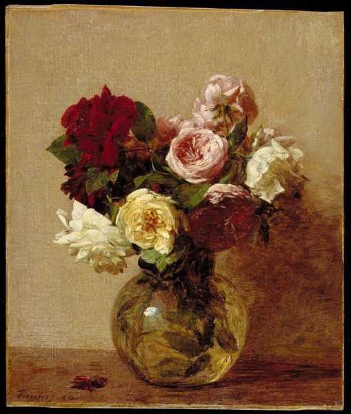 Curator: Here we have Henri Fantin-Latour's "Summer Flowers," painted in 1880. It's an oil on canvas, showcasing the artist's famed still-life prowess. What strikes you about it? Editor: It’s unexpectedly subdued. Despite the title suggesting a burst of summer vibrancy, the painting evokes a more melancholy atmosphere, almost autumnal with its muted colors and soft light. Like flowers on the verge of fading. Curator: Interesting, given Fantin-Latour’s historical context. During this period, there was an increasing demand from the rising middle class for artworks suitable for domestic display. Still life paintings, like this one, fulfilled that need, providing accessible and decorative subject matter. Editor: Makes you think about the labor involved, right? Cultivating these flowers, the canvas being stretched, the paint mixed – each step reveals layers of intention, whether conscious or not. Yet I see such tenderness. He's captured them with so much love, so gently. The petals feel incredibly soft, you know? Curator: I agree; although it looks effortless, it speaks volumes. The composition is carefully constructed, directing the viewer’s eye through a play of color and texture. Take the positioning of the roses for example - the soft peach juxtaposed with the vibrant reds draw focus and highlight the transience. Editor: Yes! That tension between fleeting beauty and structured composition...it's poetry, isn't it? Like holding onto a dream just a little longer. And the very visible brushstrokes give it all so much life! You see every bit of the making of it in a really tangible way. Curator: Absolutely, it also raises the question of the value attributed to ‘craft’. This artwork pushes those boundaries because you could almost say the value resides precisely within its apparent disposability as decoration! And the commodification of something natural, yet controlled in a domestic space, invites such thoughts. Editor: Thinking about it that way is intriguing; thank you for opening my mind. I'm now leaving this with a sense of beautiful decay. Curator: Indeed. A bouquet preserved not in bloom, but in thought, transformed by pigment and labor.