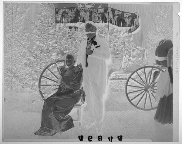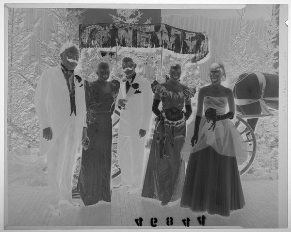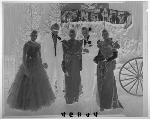 Curator: Schweig's gelatin silver print captures two couples at a New Year's party, the men sporting playful fake mustaches. There's an intriguing staged quality to this image. Editor: The overriding visual motif is the stark contrast, creating a theatrical feel, almost as if these figures are caught between reality and a dream. Curator: The context of the New Year's celebration is critical. It suggests a performance of identity, these moustaches literally masking their true selves and perhaps reflecting societal expectations of gender roles. Editor: The mustache itself is an enduring symbol of masculinity and power. Its presence here, albeit artificial, still evokes those associations. The wheel in the background feels like an emblem of shifting fortunes, or the cyclical nature of time. Curator: Exactly, and the festive yet somewhat artificial backdrop could be interpreted as a commentary on the pressures to present a perfect image during celebratory times. Editor: It certainly complicates the supposed joy of the New Year with a touch of the uncanny. What do you take away? Curator: For me, it is about questioning the narratives we construct around identity and celebration. Editor: I see it as a reminder of how deeply visual symbols shape our understanding of ourselves and others.