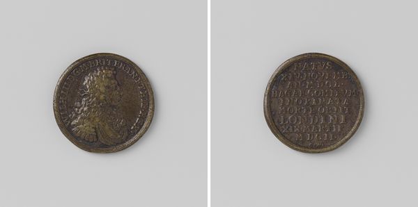 Editor: Here we have a metal medal from 1869, commemorating the fiftieth anniversary of a Masonic lodge. It was created by David van der Kellen. It feels very solemn and almost secretive in its design. What kind of symbolism do you see at play here? Curator: The most potent symbol to me is the sunburst on one side. It’s not merely decorative. Throughout history, the sun is an emblem of enlightenment, knowledge, and a guiding force, spiritually and intellectually. Editor: Interesting! Is that why it has a neoclassical style? Curator: Precisely! Neoclassicism frequently drew upon classical symbols of authority and reason, which would strongly appeal to fraternal orders like the Freemasons, emphasizing wisdom. But observe also the inscription on the reverse: "Vijftigjarig Bestaan," or "Fiftieth Anniversary." Doesn't the choice of font and its placement within that chain border strike you as deliberate? Editor: I see what you mean, the font is very austere, official almost, and it really reinforces the idea of a tight-knit community and the enduring quality of the lodge. Why include that imagery in the design? Curator: Absolutely. They are conveying permanence. Anniversaries celebrate survival, continuity, a shared heritage. Visual language becomes a cultural memory bank. The chain underscores unbreakable bonds. What stories does this tiny object whisper to us about their values? Editor: It tells of tradition and the importance of knowledge. The visuals give this medal a meaning that transcends the surface. Thank you. Curator: It was my pleasure. Thinking about the power of symbols helps unlock these objects, adding depth and resonance for us today.